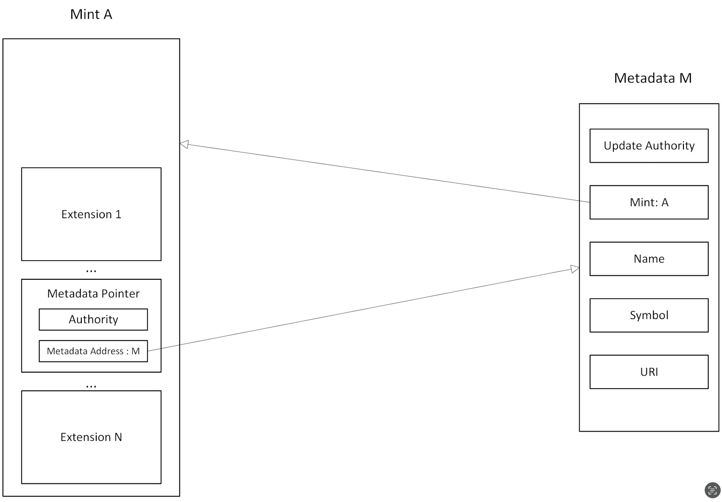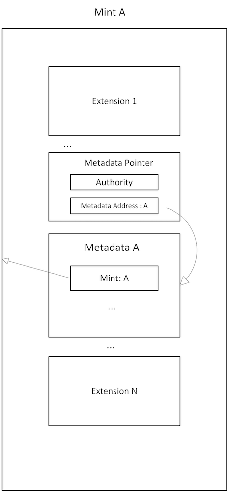 下面以Metadata和Metadata Pointer的指向关系图为例,展示一个符合预期的Metadata 与 Metadata Pointer关系。 这里有1个Mint A和Mint A的Metadata M,他们之间需要满足